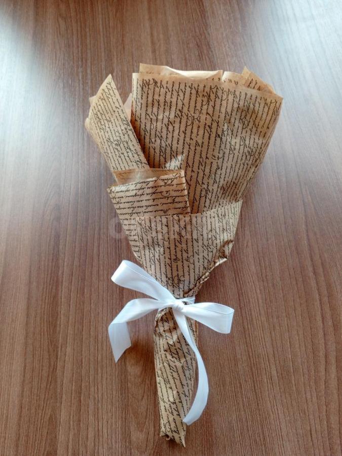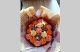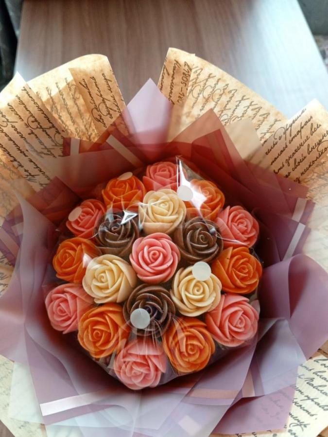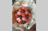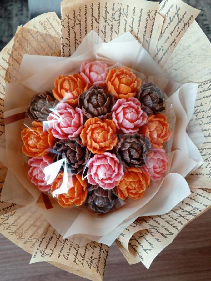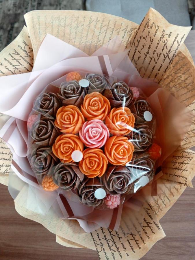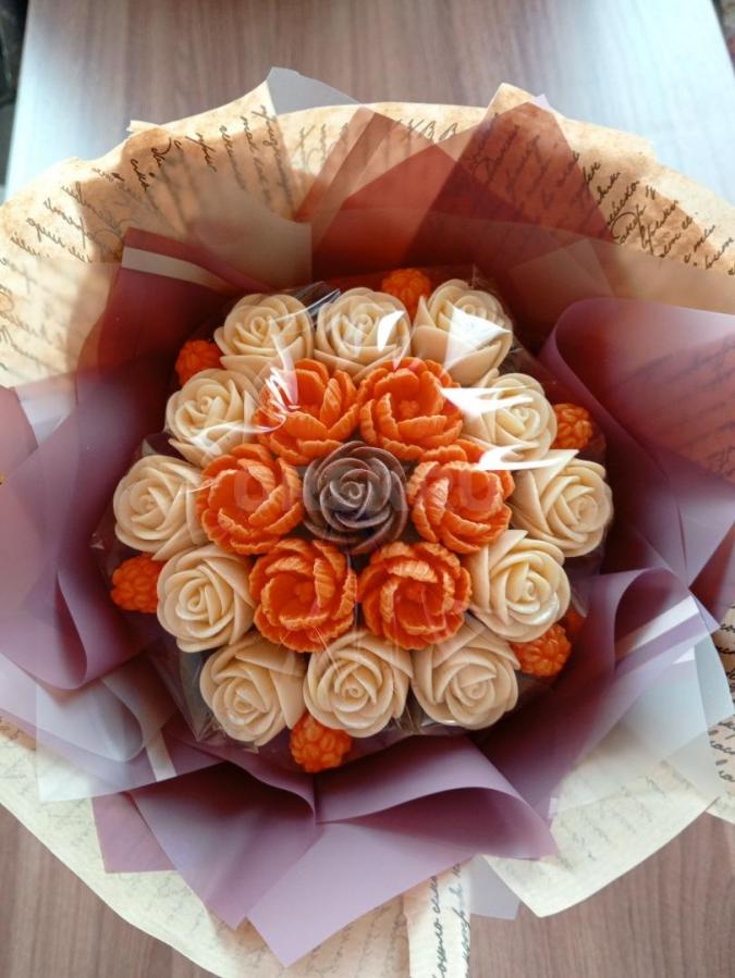 Шоколадный букет из белого, молочного и апельсинового шоколада. Диаметр шоколадной части 15-16см, всего букета 18 см . обратите внимание на фото букет выглядит крупнее. Вкусный букет который не заввянет.